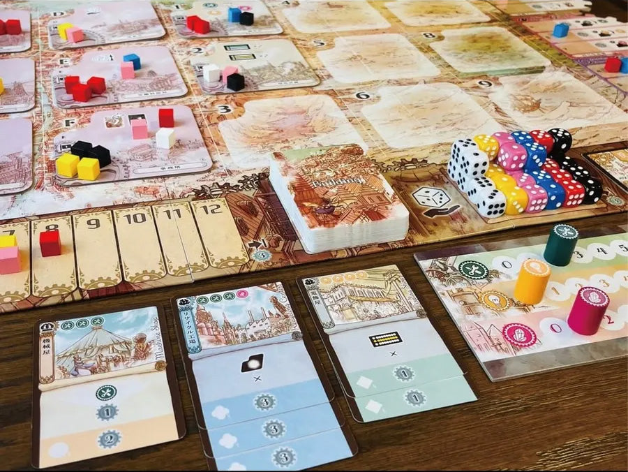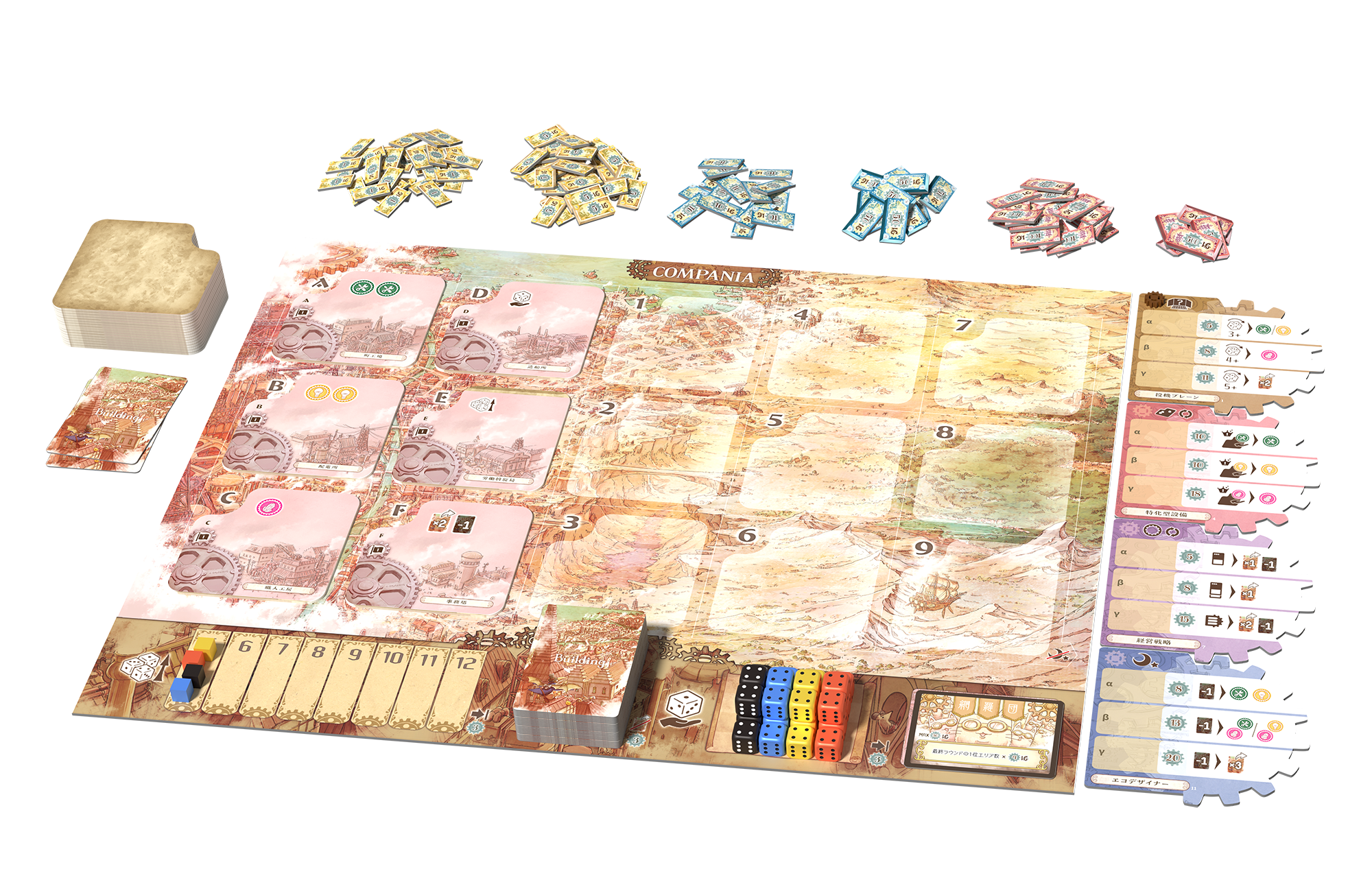Set in a steampunk city in the clouds, Compania is a new game from Japanese game designer and cartoonist Yog Akase. In a world moving on from the industrial revolution, how far will you go? How much will you earn? Explore vast and exciting world of Compania. Meet a colorful cast of characters, experience a unique market, and realize your ambitions of profit! Do you have what it takes to make it big?